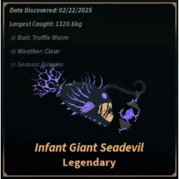 LegendaryThe Infant Giant Seadevil is a Legendary fish obtainable in the Abyssal Zenith. Due to its high rarity, it makes for a challenging catch, moving erratically across the fishing bar.