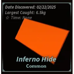 CommonThe Inferno Hide is an Common fish obtainable in the Volcanic Vents. Due to its low rarity, it makes for an easy catch if fishing in the right space, moving slow and steady across the fishing bar. Surprisingly, Inferno Hide inflicts a -20% progress speed to the player who reels it in, although it's common.