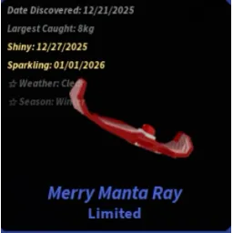 LimitedThe Merry Manta Ray is a Limited fish obtainable in Fischmas 2. It is a mild catch, moving often across the fishing bar. When reeling it in, a -35% progress speed is applied.