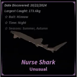 UnusualThe Nurse Shark is an Unusual fish obtainable in the Roslit Bay and The Ocean. It has a higher chance of being hooked at Roslit Bay but less in The Ocean. Due to its low rarity, it makes for an easy catch, moving slow and steady across the fishing bar.