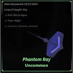 UncommonThe Phantom Ray is an Uncommon fish obtainable in the Desolate Deep. Due to its low rarity, it makes for an easy catch, moving slow and steady across the fishing bar.