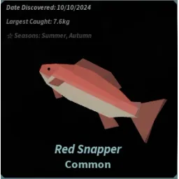 The Red Snapper is a Common fish obtainable around Moosewood. Due to its low rarity and weight, it makes for an easy catch, moving slow and steady across the fishing bar.