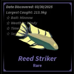 RareThe Reed Striker is a Rare fish obtainable at The Arch. Due to its extremely high rarity and effects to the player while attempting to catch it, it makes for a challenging catch, moving erratically across the fishing bar. While catching, the player is inflicted with a -28% progress speed decrease.