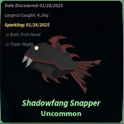UncommonThe Shadowfang Snapper is an Uncommon fish obtainable in Atlantis, in the Kraken Pool.