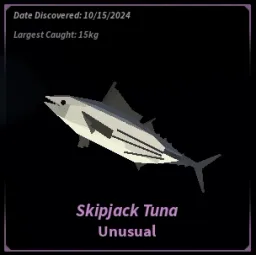 UnusualThe Skipjack Tuna is an Unusual fish obtainable in the Snowcap Island. Due to its low rarity, it makes for an easy catch, moving slow and steady across the fishing bar.