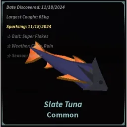 CommonThe Slate Tuna is a Common fish obtainable in the Desolate Deep. Due to its low rarity and weight, it makes for an easy catch, moving slow and steady across the fishing bar.