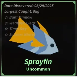 UncommonThe Sprayfin is an Uncommon fish obtainable at Waveborne in the Second Sea. Due to its low rarity, it makes it an easy catch, and moves slowly across the bar. While reeling it in, a +8% progress speed is Inflicted.