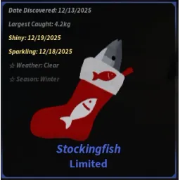 LimitedThe Stockingfish is a Limited fish obtainable during Fischmas 2025. It is a mild catch, moving often across the fishing bar.