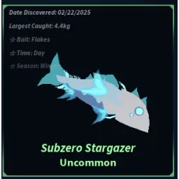 UncommonThe Subzero Stargazer is a Uncommon fish obtainable in the Challenger's Deep. Due to its low rarity, it makes for a easy catch, moving slowly across the fishing bar.