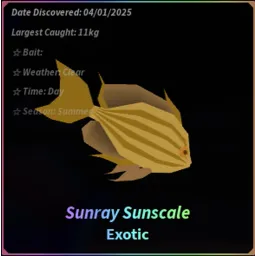 ExoticThe Sunray Sunscale is an Exotic obtainable at the Second Sea at Pine Shoals. Due to its high rarity, the fish moves erratically along the bar while inflicting a -65% progress speed upon the player when reeled. When hooked, a will pop up above the player's head, and a shimmering sound is played like every Exotic fish.