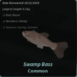 CommonThe Swamp Bass is a Common fish obtainable at Mushgrove Swamp. Due to its low rarity, it makes for an easy catch, moving slowly across the fishing bar.